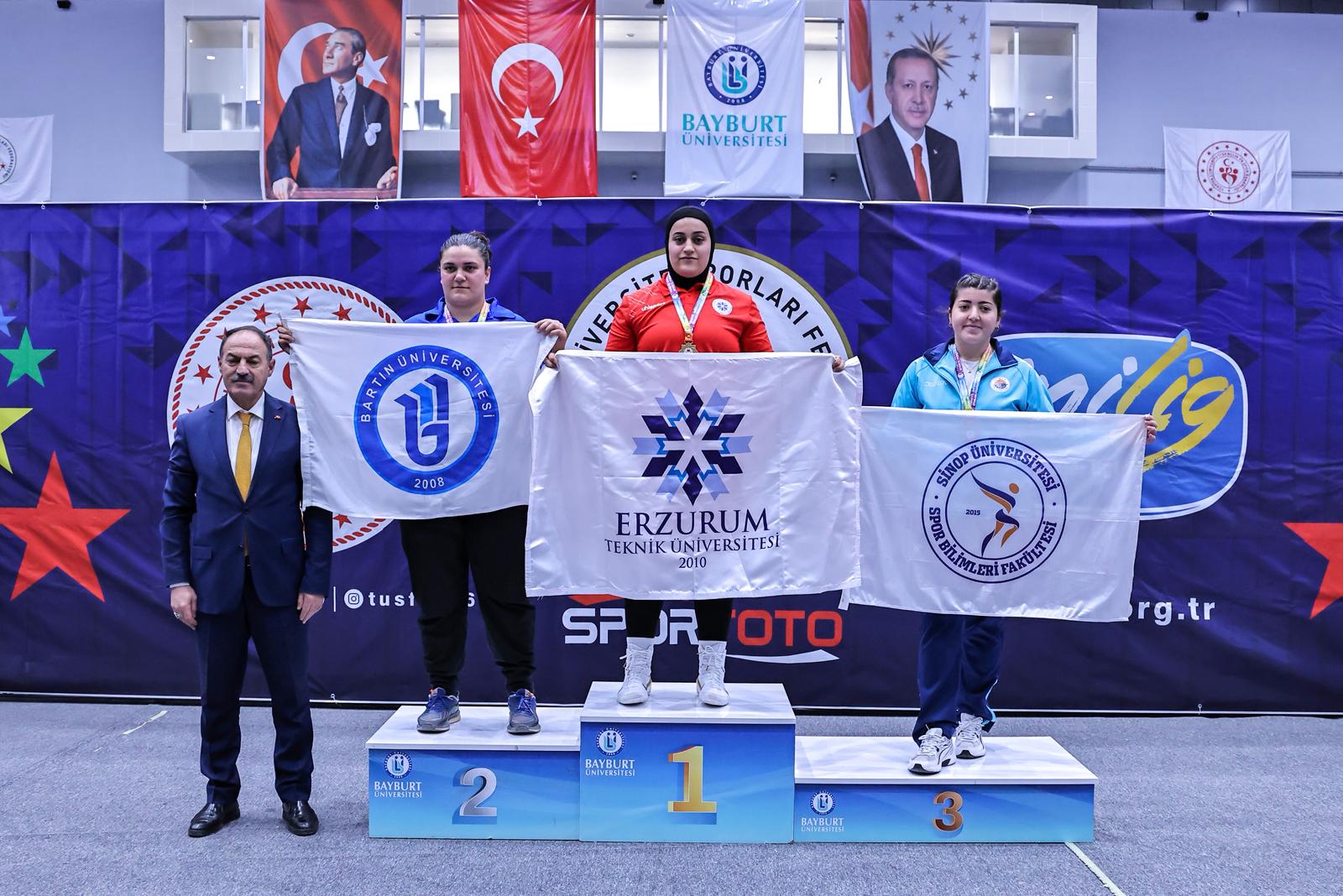 Kadınlarda ise 48 kg’da (Mardin Artuklu Üniv.), 51 kg’da Kübra Çiçek (Mersin Üniversitesi), 54 kg’da Sezen Sude Karaboğa (Mardin Artuklu Üniversitesi), 57 kg’da Ece Asude Ediz (Sakarya Uygulamalı Bilimler Üniversitesi), 60 kg’da Esmanur Lök (Dokuz Eylül Üniversitesi), 65 kg’da Sıla Biçil (Kocaeli Üniversitesi), 70 kg’da Elif Pınar Bozkurt (Zonguldak Bülent Ecevit Üniversitesi), 80 kg’da (Erzurum Teknik Üniversitesi) ve +80 kg’da Şeyma Düztaş (Erzurum Teknik Üniversitesi) şampiyonluğu elde etti.